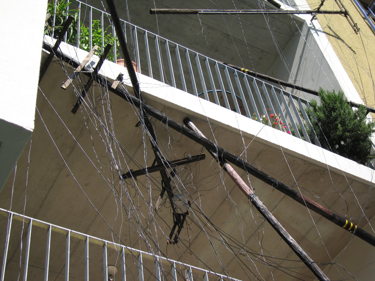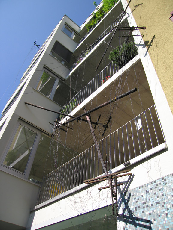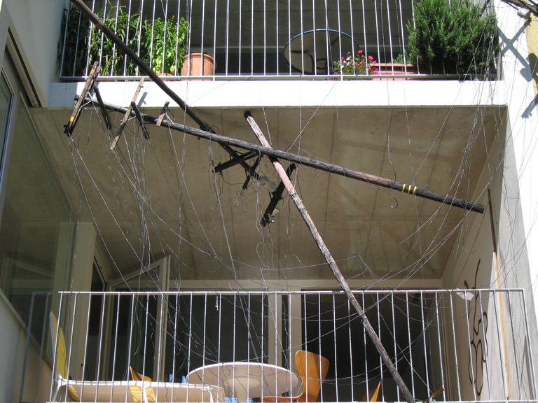 Futility Poles, wood, wire, paint, steel, hardware, apartment building, 2007-8
