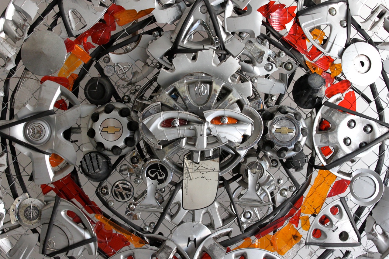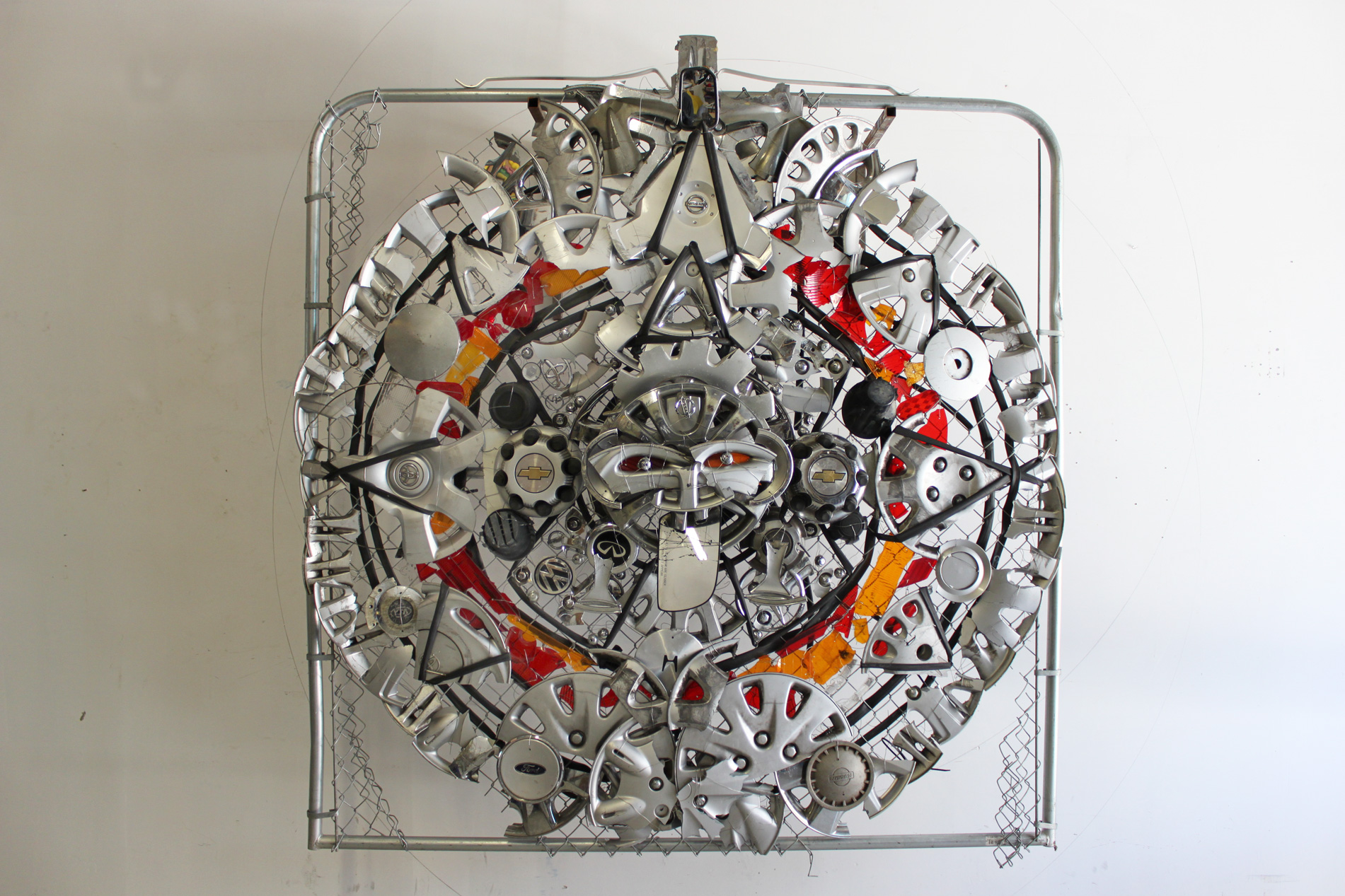 Sun Stone, chainlink gate, found car parts, bicycle tubes and parts, wire, 2011